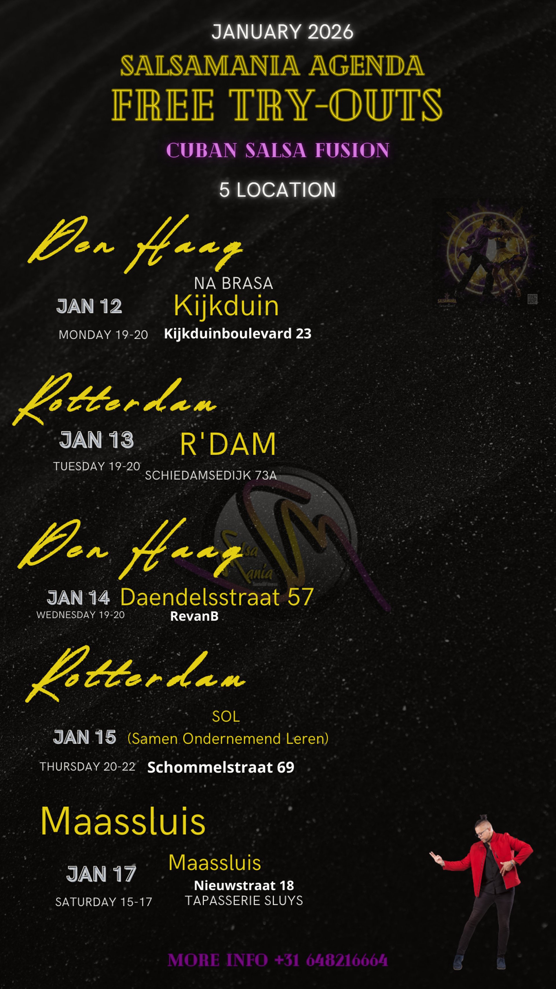 We proudly operate five locations across Rotterdam and The Hague, bringing our vibrant and professional approach to Salsa to two of the most dynamic cities in the Netherlands.